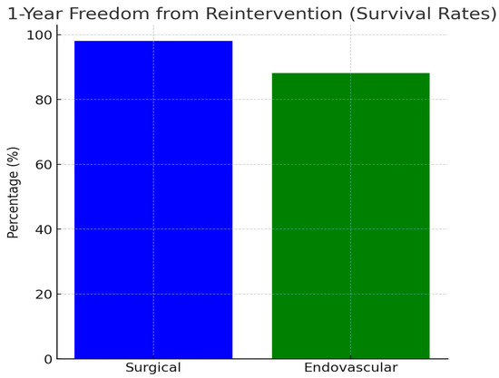 Comparison of 1-year freedom from reintervention between surgical and endovascular treatments. This figure illustrates the comparative outcomes between surgical and endovascular treatments for patients undergoing aortic coarctation repair, specifically focusing on the 1-year freedom from reintervention, which serves as a proxy for treatment durability and success over time. Surgical treatment exhibited a significantly higher 1-year freedom from reintervention rate, reaching 98.07%, compared to 88.23% for the endovascular treatment group. (The blue bar represents the surgical treatment, and the green bar represents the endovascular treatment. The y-axis shows the percentage of patients free from reintervention, while the x-axis lists the two types of procedures compared. This figure highlights the critical consideration of treatment durability, offering insight into long-term planning and patient care following aortic coarctation repair).