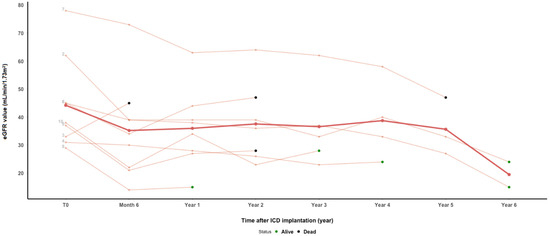 All male patients underwent the ICD implantation after a kidney transplantation. The mean time of the ICD implantation after the kidney transplantation was 9.1 years (1.8–16.5). The average age at the time of the ICD implantation was 60.6 years (49–69.4). In one patient, the ICD implantation followed a sudden cardiac arrest (SCA), while in all other patients, the ICD implantation was for the primary prevention of SCD. Nine out of ten patients suffered from ischemic cardiomyopathy, and one out of ten from idiopathic dilatative cardiomyopathy. All patients had a history of arterial hypertension prior to the ICD, and four had DM/PTDM. Kidney allograft function was reduced in all patients at the time of the ICD implantation, with an average eGFR of 44 mL/min/1.73 m2 (29–78). In a follow-up period, kidney function remained rather stable in all patients (Figure 1). After an average time of 7 years following the ICD implantation (4.5–8.9), three patients, including the female patient who received the ICD prior to a kidney transplantation, experienced end-stage kidney allograft dysfunction and were included in the hemodialysis program. All of these three patients are alive at the time of this report. Four patients experienced cardiovascular complications after the ICD implantation, two patients had a cerebrovascular accident (CVA), one a femoro-femoral bypass, and one patient had an episode of pulmonary edema, while complications related to the ICD were not recorded. After an average of 5.2 (1.6–8.5) years follow-up after the ICD implantation, six patients are alive. Four patients died with time of death ranging from 0.6 to 4.8 years after the ICD implantation (average 2.7) and functioning graft at the time of death. One patient died due to the consequences of severe COVID infection 4.8 years after the ICD implantation at the age of 53.7 years. The second patient with a history of DM and allograft rejection episodes died at the age of 55.8 years due to severe sepsis. The deaths of the remaining two patients were not related to cardiac disease, with the two of them being > 70 years old at the time of death. (Table 1 and Table 2).