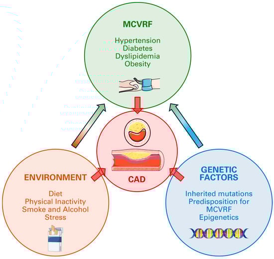 Mechanisms underlying the higher prevalence of CAD in patients with positive anamnesis for relatives affected by CAD include inherited pathologies (familial hypercholesterolemia), genetic predisposition (affecting the development of atherosclerosis via inflammation, blood pressure regulation, and cholesterol metabolism), inherited risk factors (such as diabetes, hypertension, and dyslipidemia), shared lifestyle and environment (diet, smoking, and physical inactivity), and epigenetics (Figure 1).