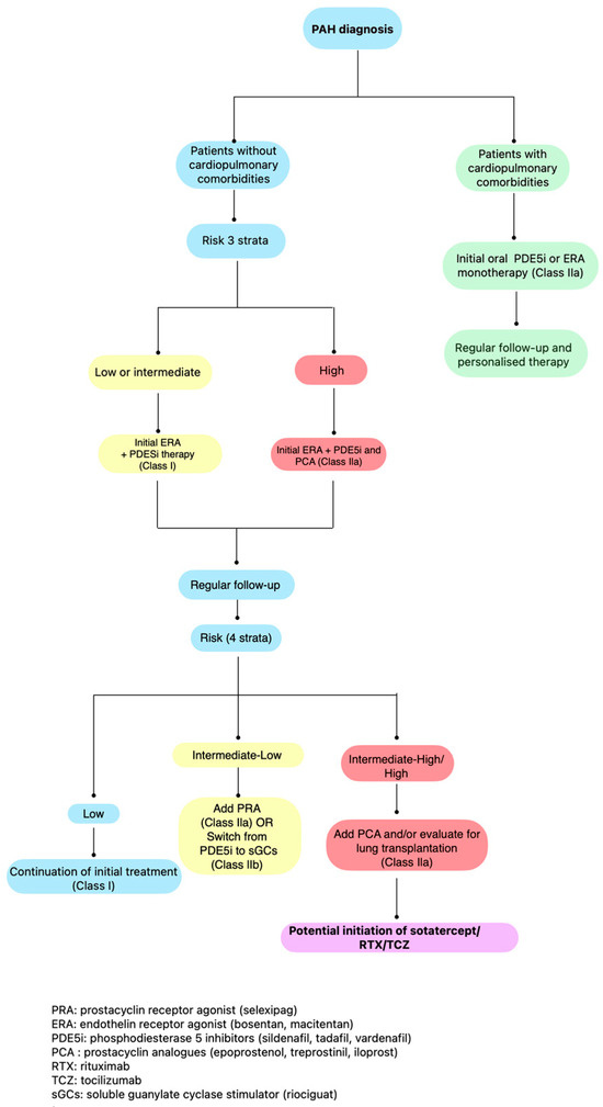 According to the latest 2022 ESC/ERS PH guidelines, risk stratification at PAH diagnosis and during follow up assessment is fundamental in guiding treatment strategy on the use of PAH-targeted therapies [4]. Patients at low and intermediate risk at baseline should be started on double combination therapy (with a PDE5 inhibitor and an ERA), while for high-risk patients, triple combination therapy with prostanoids is recommended. At follow-up assessment, patients at intermediate–high risk should be escalated to triple therapy, while those at intermediate–low risk should either change the PDE5 inhibitor to riociguat (REPLACE trial) [107] or should be started on selexipag, on top of ERA and PDE5 inhibitor (GRIPHON trial) [108]. The aim of the overall therapeutic management is to keep SSc-PAH patients to as low risk for 1-year mortality as possible. Sotatercept may be added for patients who remain at intermediate–high or high risk at follow-up (Figure 1).