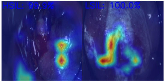 Artificial intelligence model predictions in differentiating an HSIL from an LSIL. HSIL—High-grade squamous intraepithelial lesion; LSIL—Low-grade squamous intraepithelial lesion. Image kindly provided by the working group of Precision Medicine Unir, CHUSJ/FMUP/FEUP.