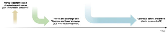 The use of AI in healthcare generates some concerns that need to be addressed for its smoother application. Besides clinical effectiveness, health economic evaluation is another critical area to consider for AI implementation in clinical practice, particularly in colonoscopy, a well-established method for CRC screening. Recent studies suggest that the use of aided-colonoscopy systems might increase short-term healthcare costs by increasing the number of detected polyps, polypectomies, and histopathological exams, in addition to the cost of the AI system itself [93,94]. However, AI-optimized optical diagnosis, when used as an alternative to actual histopathological assessment with high confidence, may significantly reduce the need for pretreatment biopsies and lower colorectal cancer rates in the long term, ultimately resulting in a reduced carbon footprint and considerable healthcare cost savings (Figure 4).
