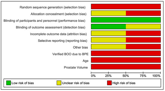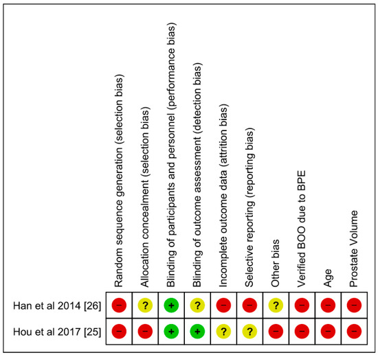 | Han et al. (2014) [26] | Retrospective comparative study, 2009–2011 | 31/372 (8%) | 31/31 (100%) CVA | 31/31 (100%) TURP | NR | Urinary retention, BOO, | Medications | 0% | 3 months | High Risk | ||