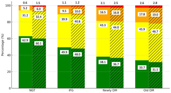 Distribution of CVD risk levels by diabetes category and gender. Notes: green, yellow, orange, and red colors represent low, moderate, high, and very high CVD risk categories, respectively. Solid bars indicate data for men, while hatched (striped) bars represent data for women.