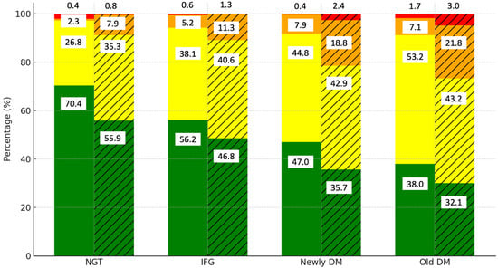 Figure 1 illustrates the distribution of cardiovascular disease (CVD) risk levels by diabetes category and gender. Among those with normal glucose tolerance (NGT), the majority of the men (62.9%) and women (60.1%) are in the low-risk category. However, as glucose tolerance worsens to IFG, the proportion of individuals in the low-risk category decreases to 49.5% in men and 48.0% in women, while the moderate-risk category rises to 39.9% and 40.8%, respectively. In the newly DM and old DM groups, the low-risk category declines further to 38.1% in men and 36.7% in women. The prevalence of high- (orange) and very high-risk (red) categories increases significantly, particularly in women, where 16.8% fall into the high-risk category compared to 16.5% of men in the newly DM group. In the old DM group, the moderate-risk category is predominant, with 45.9% of men and 46.7% of women falling into this group.