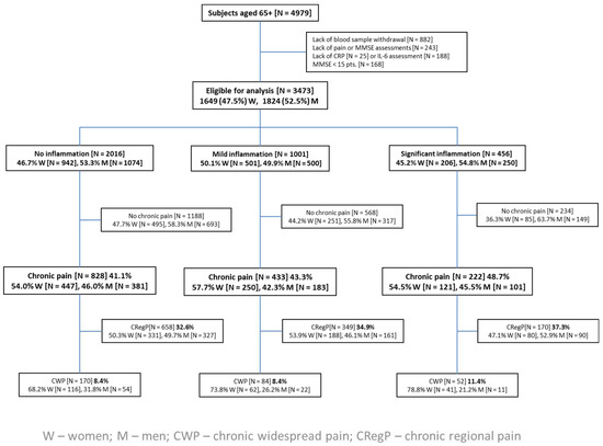 There were 3473 subjects eligible for this analysis including 456 (13.1%) with significant inflammation, 1001 (28.8%) with mild inflammation, and 2016 (58.1%) without inflammation. Chronic pain was reported in 1483 subjects (42.7% of all studied); including 306 (8.8%) with CWP and 1177 (33.9% of all analyzed) with CRegP.