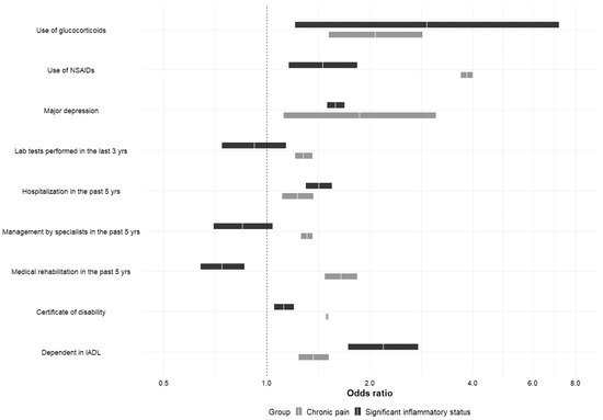The comparative analyses of associates of chronic pain and significant inflammation, adjusted to sex, showed that subjects with chronic pain more frequently utilized NSAIDs, suffered from major depression symptoms, and benefited from medical rehabilitation, specialist care, and laboratory tests, as well as possessing a certificate of disability. Contrary to this, subjects with significant inflammation were more often prescribed with GCs, were more likely to have been hospitalized during the last 5 years, and were dependent according to IADL, as seen in Figure 2 (ORs presented in Table S1).