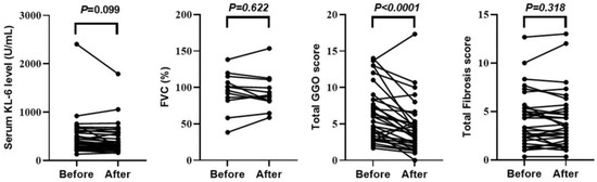 Changes in ILD indicators before and 1 year after the start of ABT administration. Paired analysis is performed using Wilcoxon’s signed-rank test. Statistical significance is set at p < 0.05. Before, before ABT administration; After, 1 year after the start of ABT administration; KL-6, Krebs von den Lungen-6; FVC, forced vital capacity; GGO, ground-glass opacity.