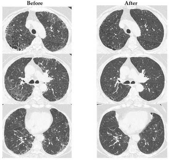 An example case of changes in chest HRCT findings before and 1 year after the start of ABT administration. The images were evaluated at three CT levels: the aortic arch, the left tracheal bifurcation, and 1 cm above the diaphragm. The extent of GGO, septal thickening, and honeycombing in each lung lobe (right upper lobe, middle lobe, lower lobe, left upper lobe, and left lower lobe) was semi-quantitatively assessed in the three images. The total GGO score improved from 11 to 5.33 points, and the total fibrosis score improved from 5.67 to 3.33 points. Before: before ABT administration; After: 1 year after the start of ABT administration; GGO: ground-glass opacity.