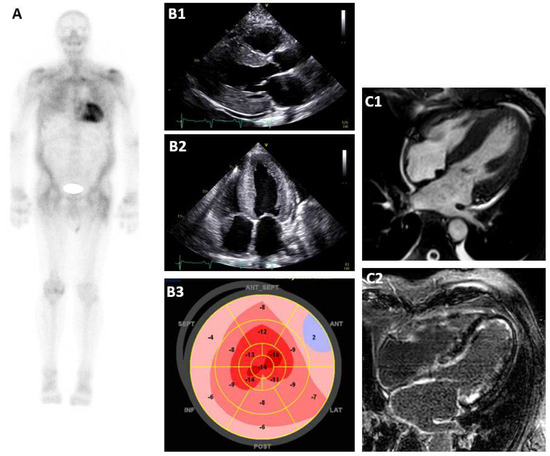 Typical findings in different imaging modalities. (A): Bone scintigraphy Perugini score 3, (B1): EC parasternal long axis, (B2): EC apical 4−chamber−view, (B3): apical sparing in strain analysis, (C1): CMR 4−chamber−view, and (C2): CMR diffuse LGE.