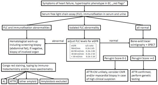 In recent years, various cardiologic and hematologic societies have published a number of diagnostic algorithms that differ only in a few details [12,22,49,50,51,52,53]. An algorithm published in 2023 by the European Society of Cardiology (ESC) highlights the importance of early free light chain (FLC) diagnostics as described above (Figure 3). If cardiac amyloidosis is clinically suspected, which is usually based on heart failure symptoms and typical abnormalities in echo or cardiac MRI, the next step should be to determine FLC in serum and immunofixation in serum and urine (spontaneous urine is sufficient). In the case of abnormal light chain levels, it is important to note whether one light chain is significantly elevated and immunofixation actually indicates a monoclonal gammopathy or whether light chain levels are only slightly abnormal, immunofixation is negative and chronic kidney disease is present. In the latter case, the abnormal light chains can be explained by impaired kidney function as eGFR-adapted FLC ratio reference ranges are suggested for patients with chronic kidney disease (see Figure 3). In this situation, the subsequent bone scintigraphy with grade 2/3 cardiac tracer uptake can lead to the non-biopsy diagnosis of cardiac ATTR amyloidosis. A TTR gene mutation analysis must then be added to discriminate between hereditary and wild-type disease. If a monoclonal gammopathy was detected in the light chain diagnostics, the further diagnostic steps depend on which amyloidosis appears more likely in the context of the findings (age, evidence of extracardiac manifestations, level of monoclonal free light chains in the serum).