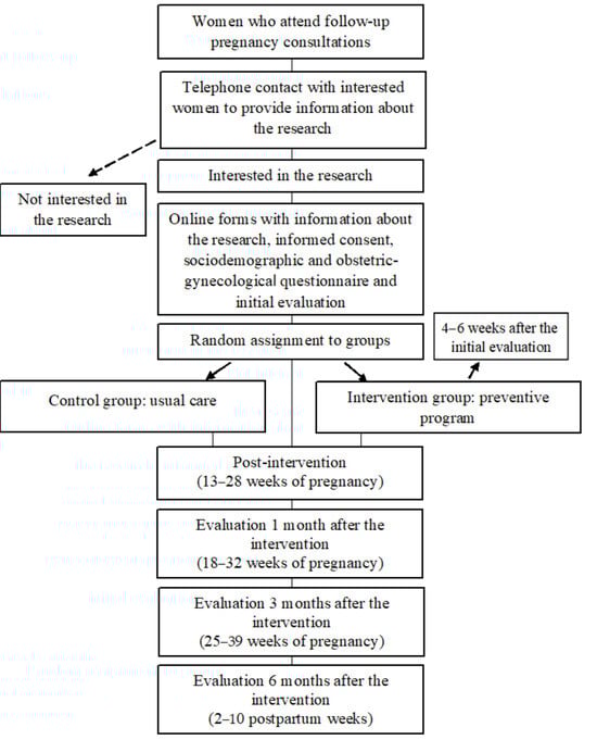 The design (Figure 1) is a two-branch random controlled design with participants who will receive the intervention protocol assigned to the intervention group and those who will receive the usual care assigned to the control group. The intervention will begin between 4–6 weeks after the initial evaluation. Usual care consists of attending pregnancy follow-up and monitoring appointments, resolving any questions that may arise during the process with the midwives, and attending group prenatal preparation classes. Participants will be assessed before and after, and one, three and six months after finishing the intervention. The trial is registered on ClinicalTrials.gov (accessed on 20 September 2024). The registration ID is NCT06609291.