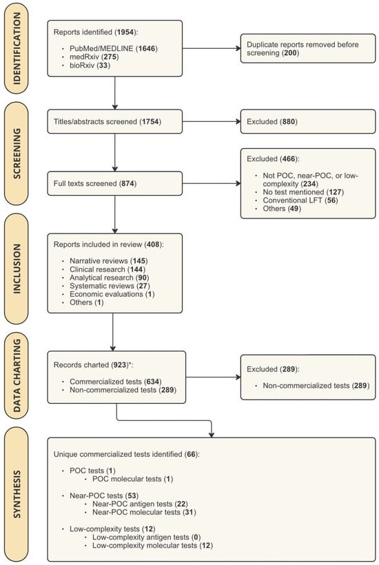 The literature search yielded 1954 results, which were imported into Covidence for screening. After removing 200 duplicates, 1754 articles underwent title/abstract screening. Of these, 874 were eligible for full-text screening. Common reasons for exclusion included assays and instruments not designed for peripheral settings (n = 234), no mention of specific tests (n = 127), and reporting on conventional LFAs without reading devices or enhanced detection technologies (n = 56) (Figure 1). Ultimately, 408 articles were included, identifying 66 commercialized diagnostic tests.