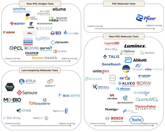 Logo chart illustrating the 63 manufacturers of the 66 included diagnostic tests, sorted by test performance as indicated in the scorecard. Abbreviations: PoC = Point-of-Care.