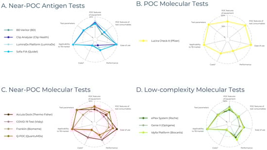 Scorecard performance of the three highest-scoring diagnostic devices across the seven scoring categories, expressed as percentages. (A) Four near-POC antigen tests are displayed because BD Veritor, Clip Analyzer, and Sofia FIA received the same score. (B) Only one POC molecular test is shown since we only identified one test in this category. (C,D) The three highest-scoring near-POC and low-complexity molecular tests are shown, respectively. Abbreviations: PoC = Point-of-Care. Legend: * costs (including capital costs and consumable costs) were not reported for most diagnostic tests, resulting in a score of 1/5 (displayed as 20%).