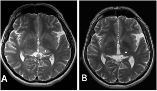 (A) Pre-procedural T2-weighted axial image in the same patient with Cognard type IV falcotentorial DAVF showing a bilateral thalamic edema (asterisk). (B) Control postprocedural T2-weighted axial image performed 2 years after intervention demonstrates complete resolution of the thalamic edema (asterisk).