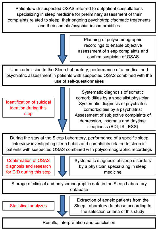- A comprehensive diagnosis of their possible psychiatric comorbidities (including assessment of suicidality [thoughts of death, passive or active SI, history of suicide attempts, non-suicidal self-injury, and suicide equivalents]) by a physician specialized in psychiatry attached to the Sleep Laboratory using a standardized psychiatric interview structured according to diagnostic criteria of the DSM-IV-TR (before 2013) and DSM 5 (after 2013) [26,27].