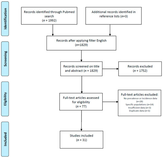 Initially, 1995 publications were found, and after restriction to publications in the English language, 1829 publications remained. All publications were screened for eligibility based on the title and abstract, after which 77 publications remained. These were screened full text for suitability. Twenty-eight studies were excluded because they did not contain data on the prevalence or incidence of SjD; in three other studies, the data were insufficient to be included, and one study contained data already presented in another publication. Fourteen studies were excluded since they only investigated specific populations. This resulted in 31 included studies. The included studies, of which 21 provided only prevalence ratios, 5 provided only incidence ratios and 5 provided both, were assessed for quality and included for data extraction (Figure 1).