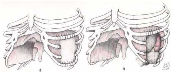 Phrenoplasty techniques for reconstruction of basal chest wall defects: The diaphragm is not involved in chest wall resection (a). The diaphragm is involved in chest wall resection (b).