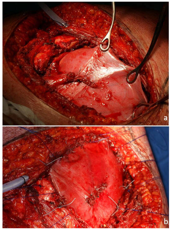Intraoperative view. Resection of the 7th and 8th ribs without involving the diaphragm. Full-thickness defect in the area of the costophrenic recess (a). The repair is performed by suturing the diaphragm circumferentially at the edges of the defect (b).