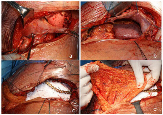 Intraoperative view. Resection of the 9th and 10th ribs involving the diaphragm. The chest wall en bloc with the lateral diaphragm is resected. The diaphragm is prepared for translation towards the 8th rib as a pedicled muscle flap. The stitches serve as temporary grasps to better fashion the necessary flap (a). The new diaphragm is used as a muscle flap to divide the chest and the abdomen, excluding the defect from the pleural cavity. The diaphragm is sutured to the 8th rib with single stitches (b). The abdominal defect is repaired/reinforced with a PTFE mesh, and a titanium bar is positioned to replace one costal arch (c). The omental flap is used to fill the gap with autologous tissue and to reinforce the local vascular supply (d).