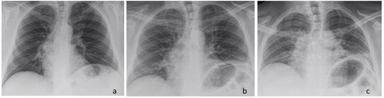 Chest X-ray: Pre-operative finding—inspiration view (a). Post-operative finding—inspiration view (b). Post-operative finding—expiration view (c).