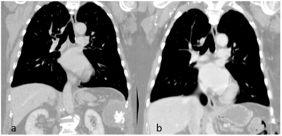 Coronal view computed tomography scans: Pre-operative finding (a). Post-operative finding (b).