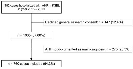 In total, 1182 cases with the ICD-10 codes specified in Table S1 were extracted from the hospital database for the study. Of these, 147 cases were excluded due to declined general research consent, and 275 cases were excluded because the presentation was not due to AHF as a main diagnosis. This resulted in a study sample of 760 cases. The enrolment process with exclusion criteria and respective number of cases is presented in Figure 1.