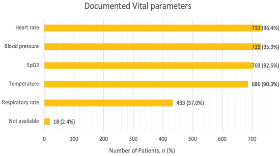All the recommended vital parameters, including heart rate, rhythm, respiratory rate, oxygen saturation and blood pressure, were assessed in 51.2% of all cases. Heart rate as well as blood pressure were the most frequently assessed and documented vital parameters, in nearly the entirety of the cohort with 96.4% and 95.9%, respectively (Figure 2). Oxygen saturation was assessed in 92.6%, and body temperature measurements were captured in 90.3% of the cases. Respiratory rate was documented in 56.9% of cases. Vital parameters were not documented in 2.4% of the cases.