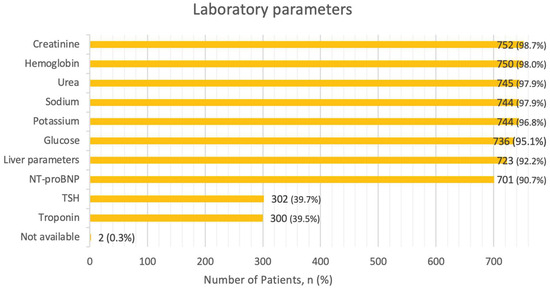 Regarding laboratory parameters, in only 16.8% of cases all recommended tests (NT-proBNP, troponin, BUN or urea, creatinine, electrolytes, glucose, blood count, liver parameters, and TSH) were assessed. Creatinine and hemoglobin were the most frequently assessed parameters (98.9% and 98.7%, respectively). Electrolytes potassium and sodium were determined in 97.9% of the cases. Urea levels were checked in 98.0%, blood glucose levels were determined in 96.8%, and liver parameters were obtained in 95.1% of the cases. The NT-proBNP level was obtained in 92.2%, with a median value at admission of 5548.5 ng/L (IQR: 2590.3–13,613 ng/L). TSH and troponin levels were measured in 39.7% and 39.5% of the cases, respectively. The recommended laboratory analyses were not performed in 0.3% of the cases. Percentages of assessed laboratory parameters are presented in Figure 3.