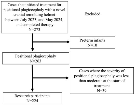 Participants are shown in Figure 2. During the study period, 273 infants started and completed therapy with baby band2. Of these, 10 preterm infants with a gestational age of less than 37 weeks were excluded from the study. In addition, 39 patients with less than moderate positional plagiocephaly who underwent helmet therapy at the family’s request were excluded from the study. The total number of participants was 224, of whom 58 were treated at Nihon University Itabashi Hospital (Doctor 1), 85 at Iino Hospital (Doctor 2), and 26 at Kobari General Hospital (Doctor 3), whereas 29 at Tsuchiya Children’s Hospital and 26 at Itabashi Central General Hospital were treated by the same physician (Doctor 4). Table 1 shows the severity of patients with positional plagiocephaly treated by each doctor. There was no bias in the severity of positional plagiocephaly treated by each physician (p = 0.585).