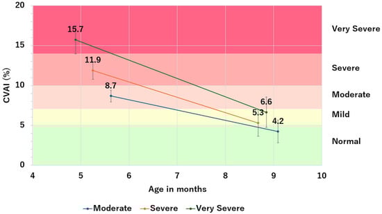 Figure 3 shows participants’ CVAI before and after helmet therapy, analyzed based on severity. Helmet therapy improved distortion of the head with a mean value of −9.1 ± 2.3 for the most severe group (n = 29), −6.6 ±1.8 for the severe group (n = 112), and −4.4 ± 1.4 for the moderate group (n = 83). Infants with higher severity had more improvement in CVAI (p < 0.001, Table 2). The mean duration of therapy was 4.0 months in the most severe group, 3.4 months in the severe group, and 3.5 months in the moderate group, with the duration being the longest in the most severe group (p = 0.028, Table 3).