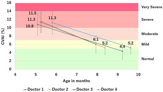 Figure 4 shows CVAI before and after helmet therapy for each attending physician. CVAI improvement was noted for all physicians, although significant differences were found among the physicians (p < 0.001, Table 5). The duration of helmet use had a small effect on CVAI improvement; no significant difference was observed (p = 0.402, Table 6).