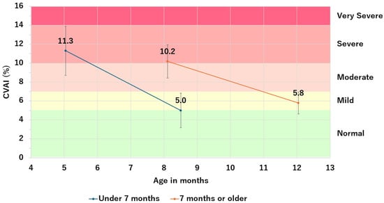 Figure 5 shows changes in CVAI for the group that started therapy at <7 months (n = 202) and the group that started at >7 months (n = 22). The group that started therapy at <7 months had a greater improvement in CVAI, to −6.3 ± 2.3 after therapy, while the >7 months group improved to −4.4 ± 1.6 (p < 0.001, Table 7). The mean duration of therapy was an average of 3.5 months for the <7 months group and 3.9 months for the >7 months group (p = 0.043, Table 8).