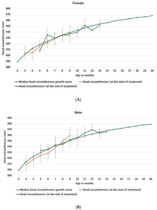 (A) Head circumference growth curve vs. head circumference growth curve during helmet therapy (Females). The head circumference growth curve was cited from [24]. (B) Head circumference growth curve vs. head circumference growth curve during helmet therapy (Males). The head circumference growth curve was cited from [24].