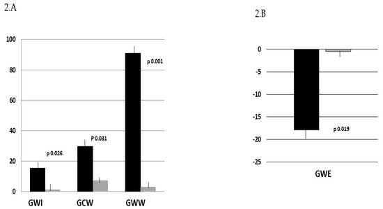 Percentage changes in GWI, GWC, GWW (2.A), and GWE (2.B) during isometric knee extension (peak exercise vs. rest) in the IHD (black bars) and HC (gray bars) groups. IHD = ischemic heart disease; HC = healthy controls; GWI = global work index; GCW = global constructive work; GWW = global wasted work; GWE = global work efficiency.