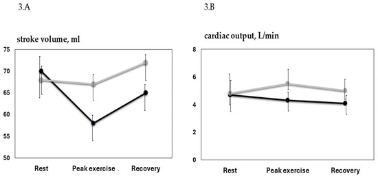 Changes in stroke volume (3.A) and cardiac output (3.B) during isometric exercise in the IHD (black line) and HC (gray line) groups.