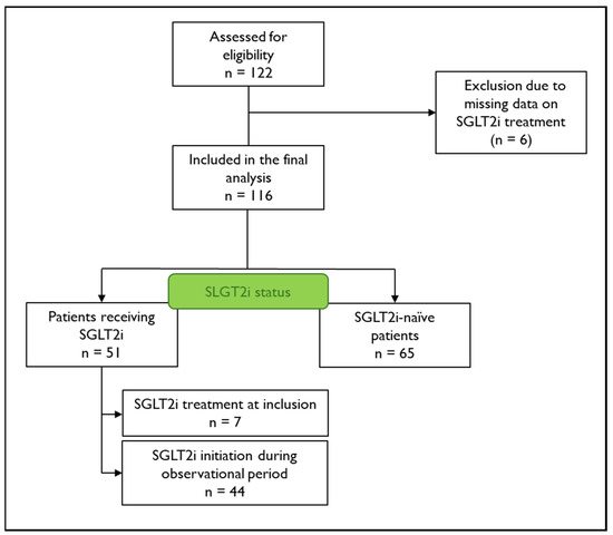 This is a longitudinal analysis of the prospective Graz Hypertrophic Cardiomyopathy (HCM) Registry, including all participants with a confirmed diagnosis of ATTR-CM who were enrolled between February 2019 and December 2022 (n = 122). ATTR-CM was diagnosed according to international recommendations based on confirmation by amyloid scintigraphy in combination with free light chain assessment or, in unclear cases, tissue organ biopsy [16]. Prior and concomitant SGLT2i treatment was systematically assessed according to the patient interview and medical records. Six participants (5%) were excluded from the analysis if data on SGLT2i treatment was not available, leading to a number of 116 patients eligible for analysis (Figure 1). All patients provided written informed consent. Approval was granted by the local ethics committee (EC-No. 30–286 ex 17/18), and the study was conducted in compliance with Good Clinical Practice and the Declaration of Helsinki.