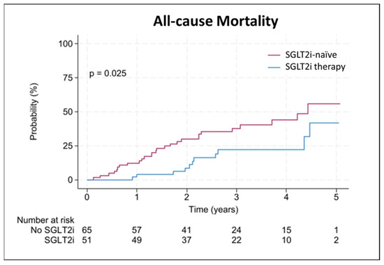 Associations between SGLT2i therapy and all-cause mortality. Kaplan Meier plot illustrating event probability for all-cause mortality with (blue) and without (red) sodium-glucose co-transporter 2 inhibitor (SGLT2i) therapy.