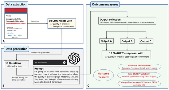 The study flowchart. (A) Data extraction protocol, (B) data generation using the ChatGPT protocol, and (C) outcome measures protocol.