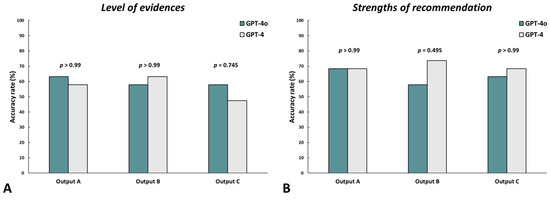 We also assessed the accuracy rate to compare the ChatGPT responses between the GPT-4o and GPT-4 versions. With regard to the level of evidence, the accuracy rate exhibited no statistical differences in outputs A (p > 0.99), B (p > 0.99), and C (p = 0.745) between the GPT-4o and GPT-4 versions (Figure 2A). With regard to the strengths of the recommendations, no statistical differences were observed in outputs A (p > 0.99), B (p = 0.495), and C (p > 0.99) between the GPT-4o and GPT-4 versions (Figure 2B).