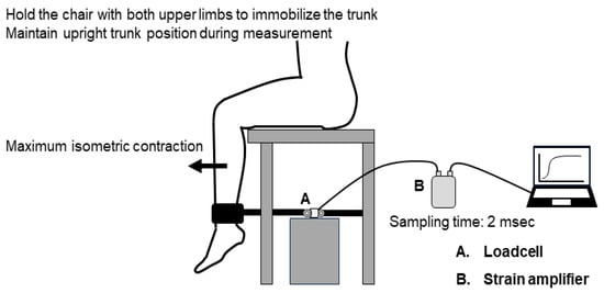 Participants were instructed to extend their knees for 3 s “as fast with maximum force” as possible following a 3 s countdown [14,18,19,20]. Standardized verbal encouragement was provided by the raters during each trial. The quadricep isometric strength was converted into electrical quantities and subsequently recorded using a strain amplifier (TSA-210, Takei, Niigata, Japan) at a sampling rate of 500 Hz (sampling time of 2 ms). The strain amplifier device was connected to a personal computer via a universal serial bus (USB) cable. The rater confirmed that each measurement trial was properly performed by checking the muscle force waveform displayed on the monitor. Three trials were performed for each leg after each practice trial. The rest time between trials was set at 2 min. The moment arm was measured from the lateral knee joint space to the median belt space.