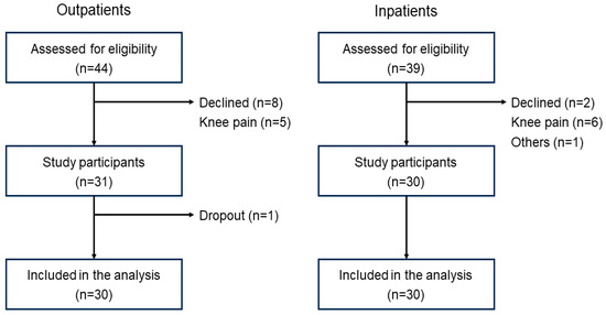 A flowchart of the patient selection process is shown in Figure 2. The characteristics of the study participants are presented in Table 1. The median ages of the outpatients (n = 30) and inpatients (n = 30) were 77 (IQR 72–81) years and 76 (IQR 74–82) years, respectively. None of the outpatients had an SPPB score of ≤9 points. The prevalence of inpatients with an SPPB score of 9 points at discharge was 56.7% (n = 17).