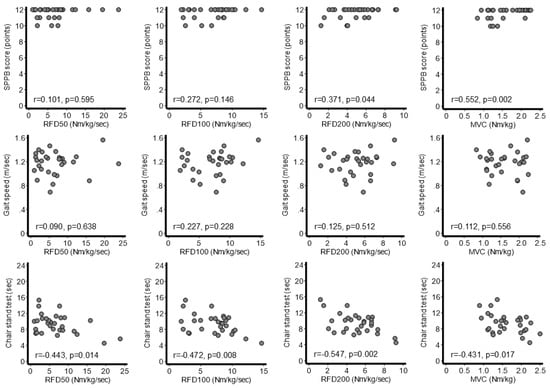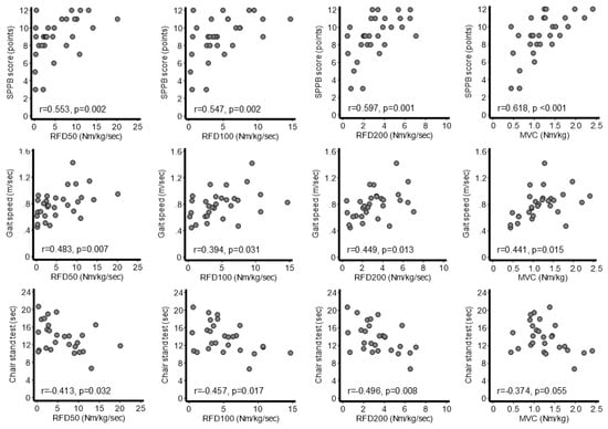 The correlations among RFD values, MVC, and physical performance in outpatients are shown in Figure 3. SPPB was significantly associated with RFD200 (r = 0.371, p = 0.044) and MVC (r = 0.552, p = 0.002), although not with RFD50 or RFD100. The 4 m gait speed was not significantly associated with any muscle strength parameters. The chair stand test time was significantly associated with RFD50 (r = −0.443, p = 0.014), RFD100 (r = −0.472, p = 0.008), RFD200 (r = −0.547, p = 0.002), and MVC (r = −0.431, p = 0.017).