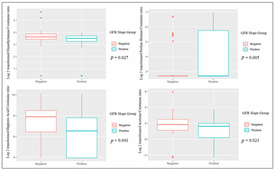 Significant differences in urinary metabolites in kidney transplant recipients with different GFR slope trajectories.