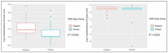 When comparing patients based on the GFR slope, several metabolites showed statistically significant differences: urinary dimethylamine, hippuric acid, and acetone exhibited higher concentrations in patients with a negative GFR slope. Conversely, urinary proline betaine was higher in patients with a positive GFR slope (Table 2 and Figure 1). Also, the plasmatic concentration of acetic acid was higher in patients with a positive slope, while formic acid had lower values when compared to patients with a negative slope (Table 3 and Figure 2).