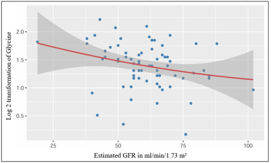 After performing a simple linear regression, we found a significant low-strength regression equation between the log 2 transformed plasmatic level of glycine and the estimated glomerular filtration rate (F (1,70) = 5.15, p = 0.026), with an R2 of 0.069 (Figure 3).