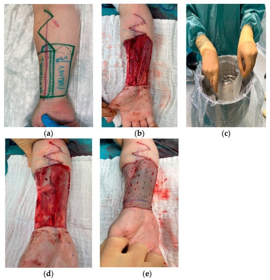 (a–e) Case example of a radial phalloplasty in a transmasculine patient. Preoperative planning and preparation of the forearm flap; extensive donor site surface with partially exposed tendons after flap elevation; preparation of the collagen sheet graft; post inset of the graft with the sutured split skin graft of the lateral thigh in place.