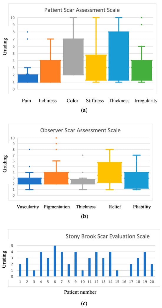 - Draaijers, L.J.; Tempelman, F.R.; Botman, Y.A.; Tuinebreijer, W.E.; Middelkoop, E.; Kreis, R.W.; Van Zuijlen, P.P. The Patient and Observer Scar Assessment Scale & colon; A Reliable and Feasible Tool for Scar Evaluation. Plast. Reconstr. Surg. 2004, 113, 1960–1965. [Google Scholar] [CrossRef]
