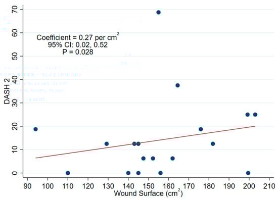 The correlation analysis between the wound surface and Disabilities of the Arm, Shoulder, and Hand for sports and music (DASH 2) scale. An increase of 0.27 cm2 in the wound surface worsened the DASH sports and music score by one point.